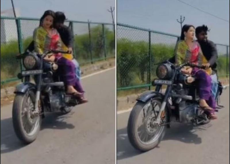 बुलंदशहर। रील बनाने का बढ़ता कल्चर और उसे वायरल करने के लिए किसी भी हद तक जाना कई बार नुकसानदायक हो जाता है। यूपी के बुलंदशहर से एक वीडियो सामने आया है। जिसमें एक युवती बुलेट के आगे बैठी है और युवक बाइक चला रहा है। उधर, वीडियो के वायरल होने पर पुलिस मामले को संज्ञान में लिया और बाइक का 13 हजार का चालान कर दिया।