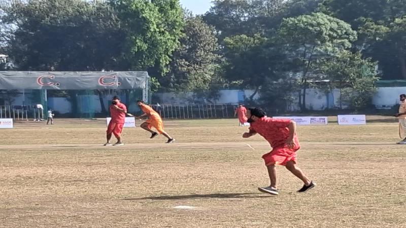 धोती-कुर्ता पहन क्रिकेट के मैदान में उतरे खिलाड़ी, लगाए चतुष्कम्-षठकम्